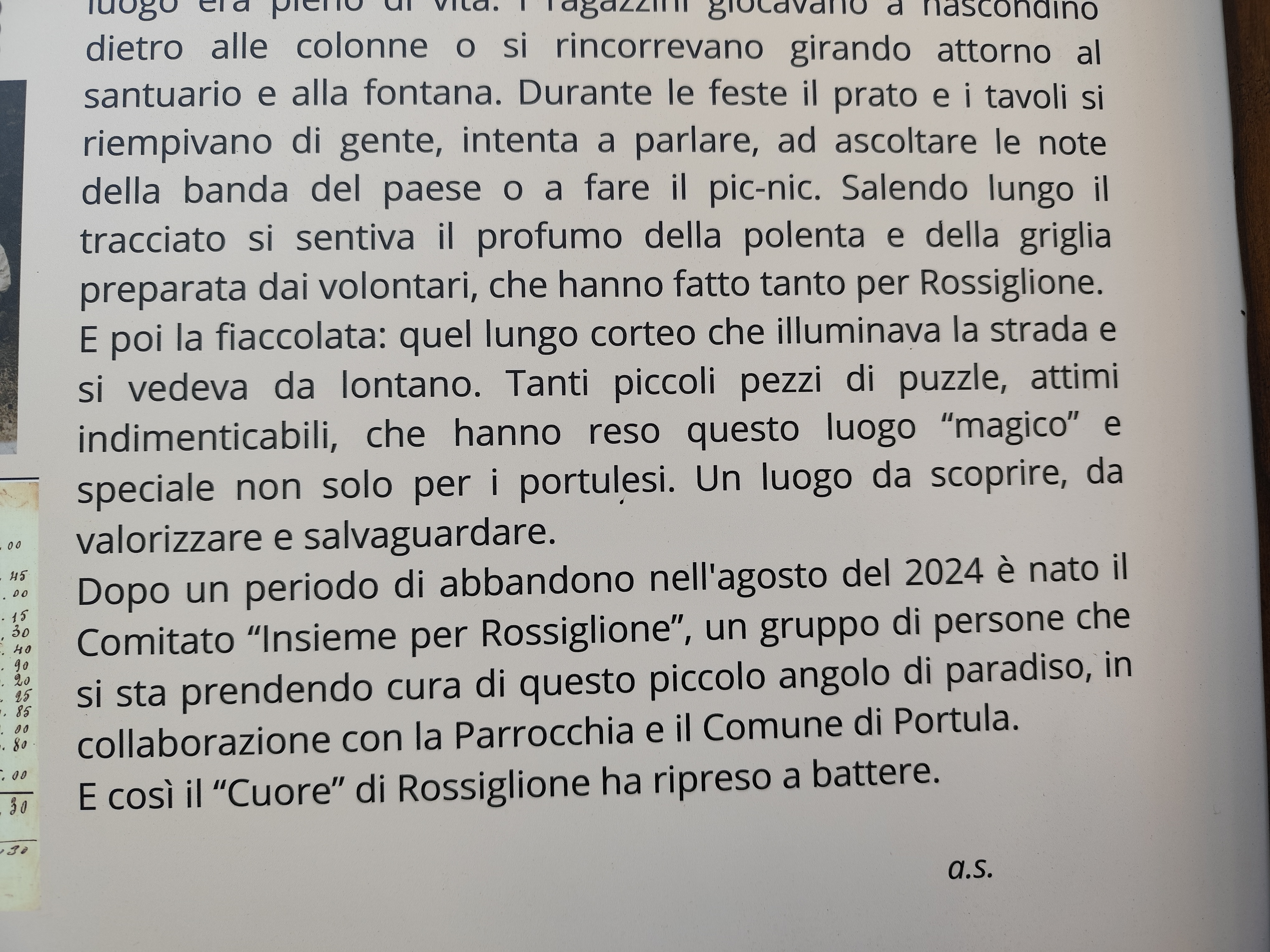 "La leggenda narra che un tempo ci fosse un castello da cui i conti di Rossiglione di Belmonte dominavano la zona. [...] Ma il Santuario di Rossiglione non è solo storia, è anche cuore.  PRima dell'abbandono quasi totale questo luogo era pieno di vita. I ragazzini giocavano a nascondino dietro alle colonne o si rincorrevano girando attorno al santuario e alla fontana. Durante le feste il prato e i tavoli si riempivano di gente intenta a parlare e ad ascoltare le note della banda del paese. Salendo lungo il tracciato si sentiva il profumo della polenta e della griglia preparata dai volontari.